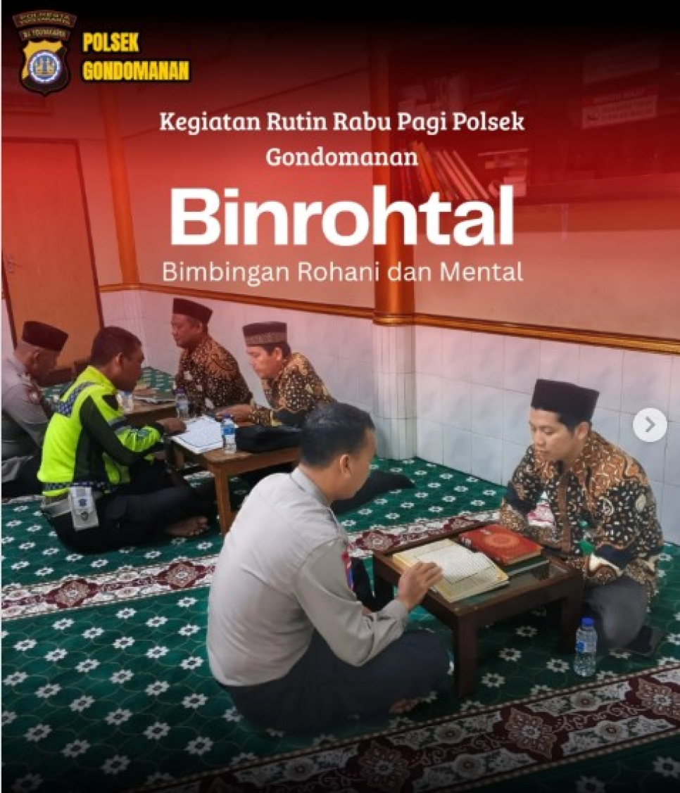 Personel Polsek Gondomanan yang beragama Islam melaksanakan kegiatan belajar membaca Al-Qur'an di Masjid Baitul Mustaqim Polsek Gondomanan, pada Rabu pagi, 28 Januari 2026. Kegiatan ini rutin dilaksanakan sebagai sarana pembinaan rohani serta untuk meningkatkan kemampuan membaca Al-Qur'an secara baik dan benar.Kegiatan tersebut bertujuan untuk memperkuat keimanan dan ketakwaan personel, sekaligus membentuk sikap mental yang positif dalam mendukung pelaksanaan tugas kepolisian sehari-hari.