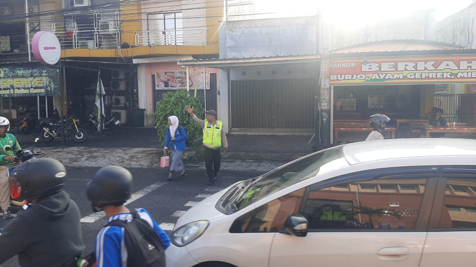 Personel Polsek Mergangsan, Aiptu Sudari Hadi, S.H., bersama Aipda Surahmad melaksanakan kegiatan rutin berupa pengaturan arus lalu lintas dan membantu penyeberangan masyarakat serta anak-anak sekolah pada Senin (2/2/2026) pagi.Kegiatan tersebut dilaksanakan mulai pukul 06.15 WIB di depan SMA UII, Jalan Tamansiswa, Kota Yogyakarta. Pengaturan lalu lintas dilakukan guna mendukung kelancaran arus kendaraan pada jam sibuk pagi hari sekaligus memberikan rasa aman bagi para pelajar yang hendak masuk sekolah.