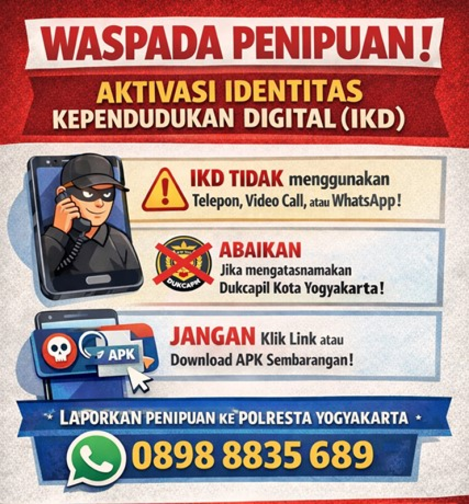 Pemerintah Kota Yogyakarta melalui Dinas Kependudukan dan Pencatatan Sipil menegaskan bahwa proses aktivasi Identitas Kependudukan Digital tidak pernah dilakukan melalui telepon, video call, WhatsApp, maupun aplikasi pihak ketiga. Aktivasi IKD hanya dilakukan secara mandiri melalui aplikasi IKD resmi yang tersedia di Play Store atau App Store.