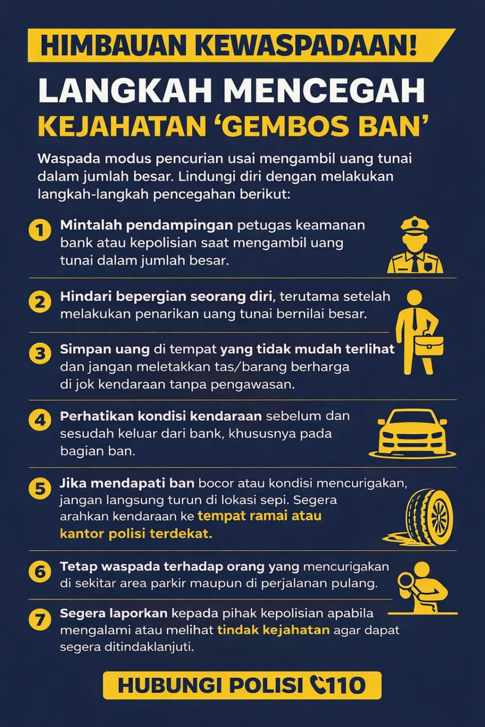 Menindaklanjuti terungkapnya kasus pencurian dengan pemberatan bermodus gembos ban pada Kamis (5/2/2026), Polresta Yogyakarta mengimbau masyarakat untuk meningkatkan kewaspadaan, khususnya saat melakukan penarikan uang tunai dalam jumlah besar di bank. Berdasarkan hasil pengungkapan, para pelaku menjalankan aksinya secara terorganisir dengan pembagian peran yang jelas, mulai dari memantau calon korban hingga mengeksekusi pencurian dengan cara melumpuhkan kendaraan korban. Modus ini tidak hanya merugikan secara materi, tetapi juga berpotensi membahayakan keselamatan korban.Polresta Yogyakarta mengingatkan masyarakat agar tidak bepergian seorang diri setelah menarik uang tunai dalam nominal besar serta dianjurkan meminta pendampingan petugas keamanan bank atau aparat kepolisian. Polri siap memberikan pengawalan sebagai langkah pencegahan untuk meminimalkan risiko tindak kejahatan. Selain itu, warga diimbau untuk selalu memperhatikan kondisi kendaraan sebelum dan sesudah keluar dari bank, terutama pada bagian ban, serta tidak meninggalkan barang berharga di dalam mobil tanpa pengawasan.