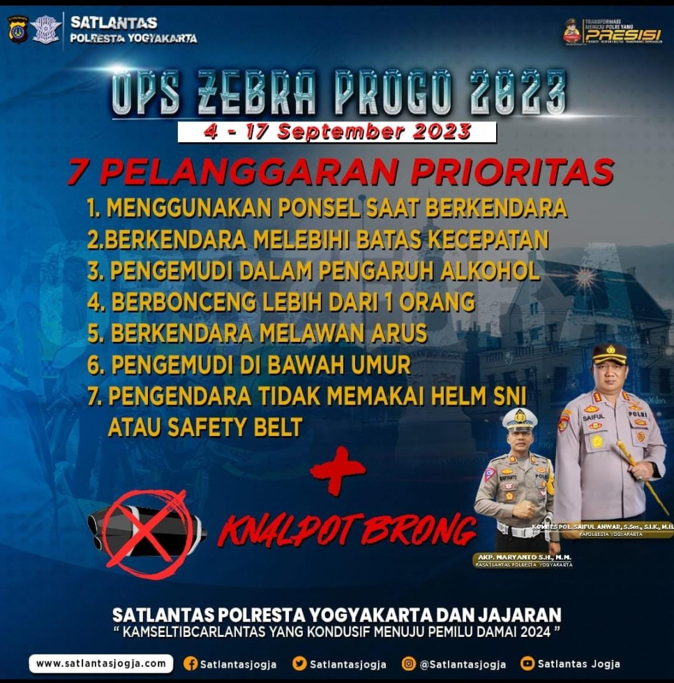 Polresta Yogyakarta menggelar Operasi Zebra Progo 2023 selama 14 hari, mulai tanggal 4 hingga 17 September 2023. Operasi ini bertujuan untuk menciptakan suasana keamanan, keselamatan, ketertiban, dan kelancaran lalu lintas (Kamseltibcarlantas) yang kondusif menuju Pemilu Damai 2024.Kapolresta Yogyakarta melalui Kasihumas AKP Timbul Sasana Raharja, SH, MH, mengimbau kepada masyarakat untuk melengkapi administrasi berkendara, seperti SIM dan STNK, serta mematuhi aturan lalu lintas.