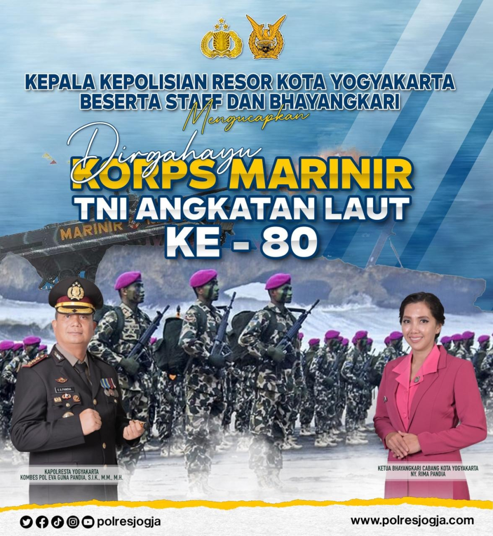 Kapolresta Yogyakarta, Kombes Pol Eva Guna Pandia, S.I.K., M.M., M.H., beserta seluruh staf dan jajaran Bhayangkari, menyampaikan ucapan selamat dan sukses atas Hari Ulang Tahun (HUT) ke-80 Korps Marinir Tentara Nasional Indonesia Angkatan Laut.Ucapan selamat ini disampaikan sebagai wujud nyata sinergitas dan soliditas antara Kepolisian Negara Republik Indonesia, khususnya Polresta Yogyakarta, dengan Tentara Nasional Indonesia (TNI).