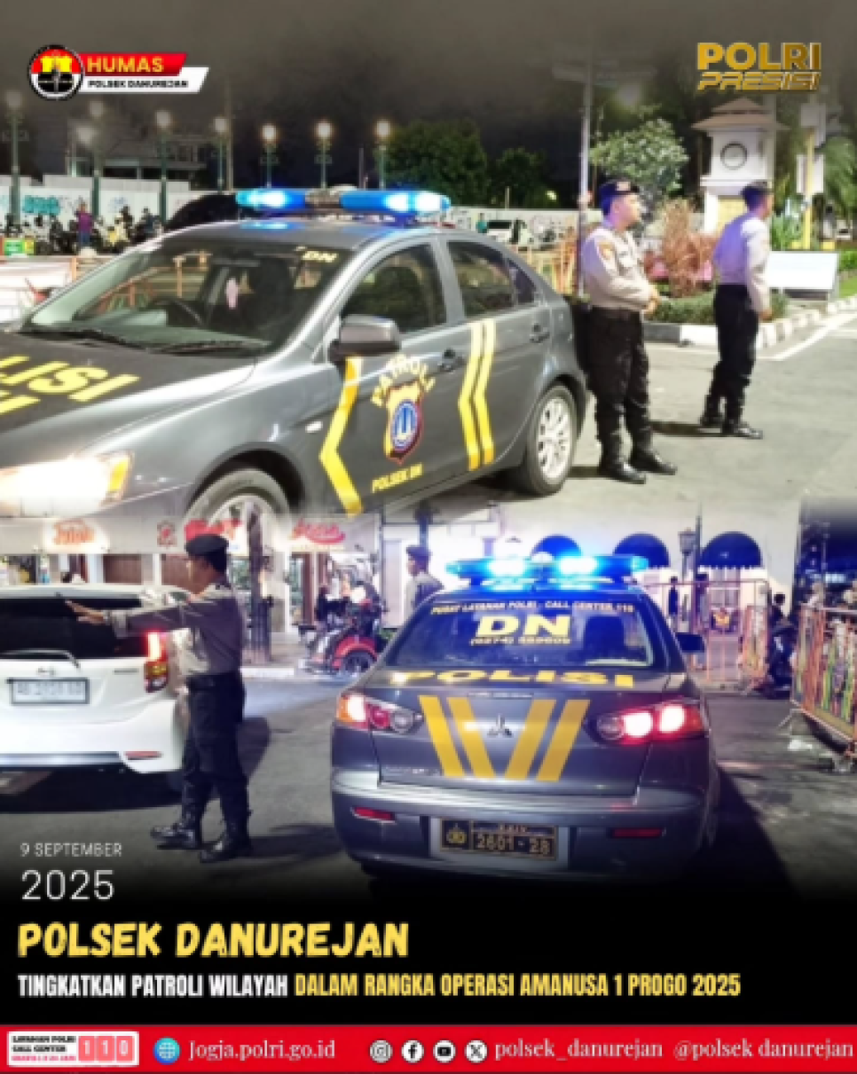 Dalam rangka mendukung pelaksanaan Operasi Aman Nusa 1 Progo 2025, jajaran Polsek Danurejan meningkatkan kegiatan patroli sambang di sejumlah objek vital dan titik rawan gangguan kamtibmas. Selasa malam (09/09/2025), patroli dipimpin Panit Samapta Polsek Danurejan Aiptu Bambang Supriono, S.H. bersama petugas gabungan.Selama kegiatan, petugas melakukan pemantauan situasi, mengatur arus lalu lintas dan membantu penyeberangan di sejumlah titik jalan Malioboro, serta berdialog dengan pengunjung, tukang becak, dan petugas parkir. Mereka dihimbau untuk tetap menjaga ketertiban, waspada terhadap potensi kerawanan, serta segera melapor bila mendapati hal yang mencurigakan. Selain itu, patroli juga menyasar perkampungan, perumahan, dan area rawan untuk mengajak warga aktif menjaga keamanan lingkungan.
