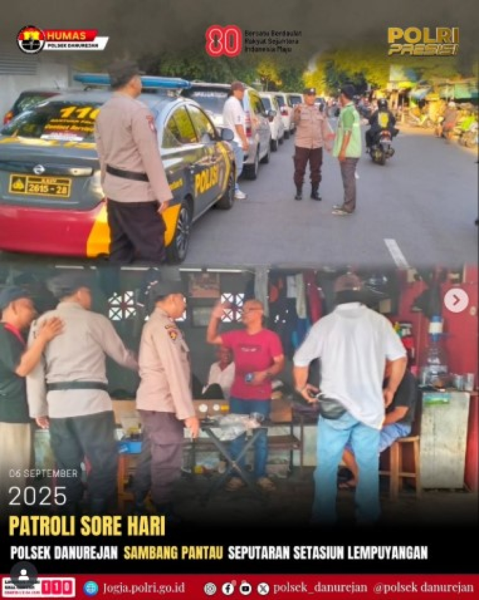 Personel Polsek Danurejan Polresta Yogyakarta melaksanakan patroli sore di kawasan Stasiun Lempuyangan pada Sabtu (6/9/2025). Kegiatan yang dipimpin Ka SPKT Polsek Danurejan, Aiptu Yulwintoro, S.H., ini bertujuan untuk menjaga keamanan dan ketertiban masyarakat, khususnya di area transportasi umum.Dalam patroli tersebut, petugas menyampaikan imbauan kepada petugas keamanan stasiun agar selalu meningkatkan kewaspadaan. Pesan serupa juga diberikan kepada juru parkir dan komunitas ojek di sekitar stasiun, agar ikut berperan dalam menjaga keamanan lingkungan.