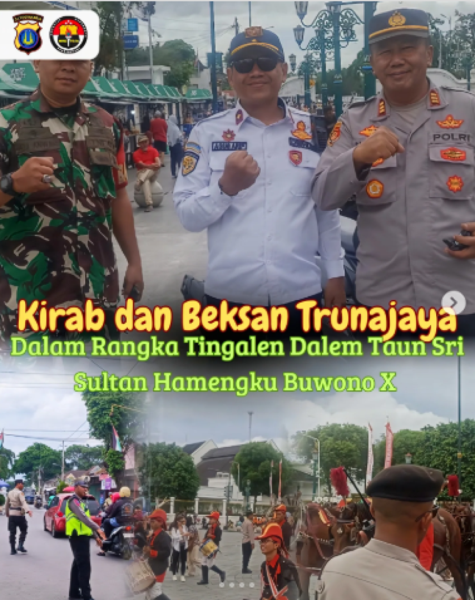 Kapolsek Gondomanan AKP Basungkawa, S.H., M.H., bersama anggotanya bergabung dengan personel Polresta Yogyakarta dalam melaksanakan pengamanan kegiatan budaya akbar Kirab dan Pergelaran Beksan Trunajaya, Rabu sore (22/10/2025). Acara ini digelar oleh Keraton Ngayogyakarta Hadiningrat dalam rangka memperingati Tingalan Dalem Taun Sri Sultan Hamengku Buwono X ke-82 Tahun Jawa.Kirab dimulai sekitar pukul 16.00 WIB dengan rute dari Gedung DPRD DIY menuju Kagungan Dalem Pagelaran Keraton. Mengusung tema "Kirab dan Pergelaran Beksan Trunajaya dalam rangka Tingalan Dalem Taun Sri Sultan Hamengku Bawono Ka-10", kegiatan ini menyedot perhatian sekitar 1.000 warga dan tamu undangan yang hadir.