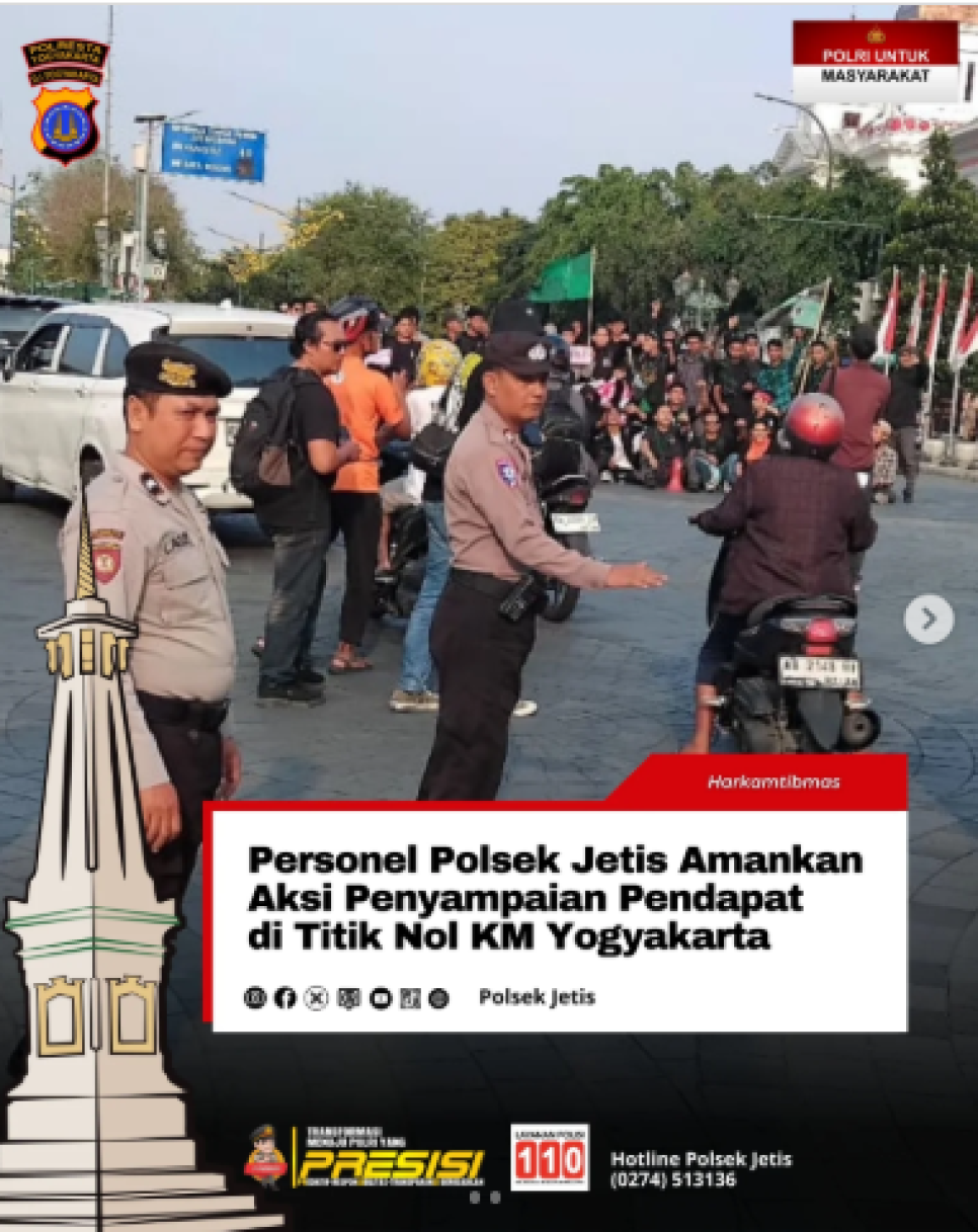 Untuk memastikan keamanan dan ketertiban unjuk rasa di Titik Nol Kilometer, personel Polsek Jetis yang dipimpin oleh Kanitsamapta Iptu Sumartana diterjunkan pada Senin, 1 September 2025. Kehadiran petugas bertujuan untuk menjaga situasi tetap aman dan kondusif selama kegiatan berlangsung.Selain mengawal jalannya aksi, personel Polsek Jetis bersama jajaran Polresta Yogyakarta juga memantau, mengatur arus lalu lintas, serta berkoordinasi dengan instansi terkait untuk mengantisipasi potensi gangguan Kamtibmas.
