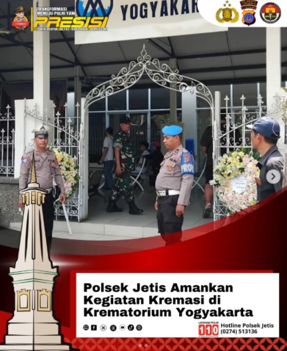Personel Kepolisian Sektor Jetis Polresta Yogyakarta melaksanakan kegiatan pengamanan dan pengaturan lalu lintas selama prosesi kremasi di Krematorium Yogyakarta pada Selasa, 7 Oktober 2025.Kegiatan pengamanan ini dipimpin langsung oleh Panit Lantas Polsek Jetis Aiptu Seno Winarko bersama anggota yang bertugas di lapangan. Pengamanan ini bertujuan ganda: memastikan seluruh rangkaian kegiatan kremasi berjalan dengan aman, tertib, dan lancar, serta menjaga ketertiban umum.