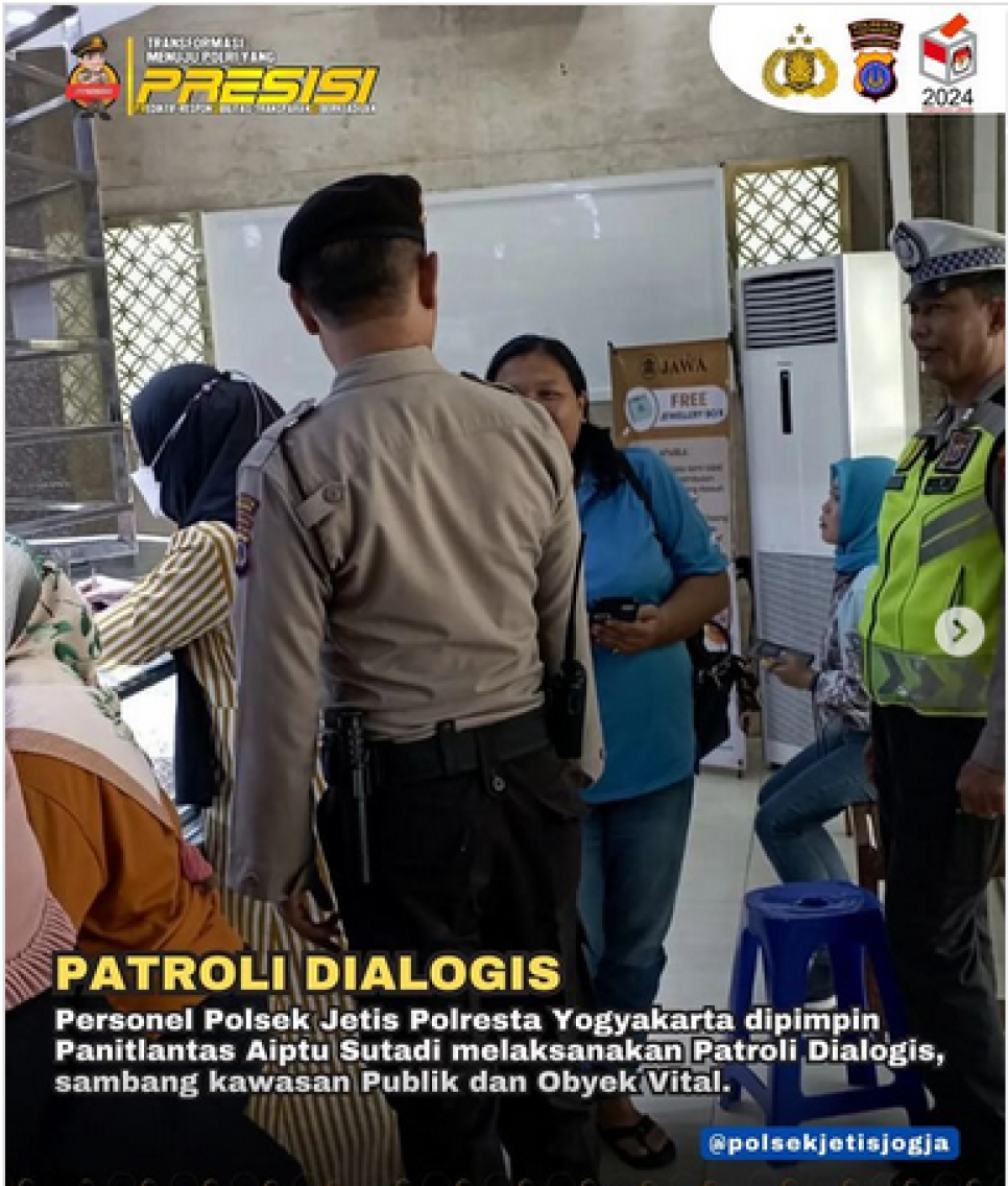 Dalam rangka menciptakan lingkungan yang aman dan nyaman, Polsek Jetis secara rutin melaksanakan patroli dialogis. Pada Selasa siang, (30/7/24), Panitlantas Aiptu Sutadi bersama anggotanya menyisir berbagai sudut wilayah Jetis untuk berinteraksi langsung dengan masyarakat.Kegiatan ini tidak hanya sekedar patroli biasa, namun juga menjadi wadah bagi warga untuk menyampaikan keluhan atau masukan terkait situasi keamanan di lingkungan mereka. Dengan pendekatan yang humanis, diharapkan terjalin hubungan yang lebih erat antara polisi dan masyarakat.