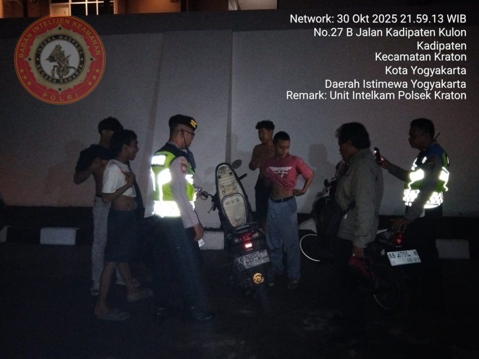 Personel Samapta Polsek Kraton Polresta Yogyakarta di bawah pimpinan Aiptu Agus melaksanakan patroli dan pemeriksaan terhadap sekelompok pemuda yang berkumpul di sekitar area Benteng Kraton, Kamis malam (30/10/2025).Patroli ini dilakukan sebagai langkah antisipasi dan pencegahan terhadap peredaran minuman keras di wilayah hukum Polsek Kraton. Kegiatan tersebut merupakan bagian dari upaya berkelanjutan Polsek Kraton dalam memberantas peredaran miras yang dapat mengganggu keamanan dan ketertiban masyarakat.