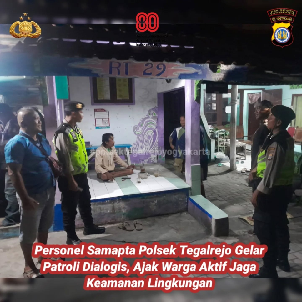 Personel Unit Samapta Polsek Tegalrejo yang dipimpin Panit 2 Samapta Aiptu Puput Tri Atmojo melaksanakan patroli dialogis di sejumlah titik wilayah hukum Polsek Tegalrejo, Rabu (05/11/2025) malam. Salah satu lokasi yang disambangi adalah pos kamling RT 29 RW 05 Kampung Demakan, Kelurahan Tegalrejo.Kehadiran petugas disambut hangat oleh warga yang tengah bertugas jaga malam. Dalam kesempatan itu, Aiptu Puput berdialog dan bertukar informasi seputar situasi kamtibmas, sekaligus memberikan motivasi agar warga terus menjaga keamanan lingkungan.