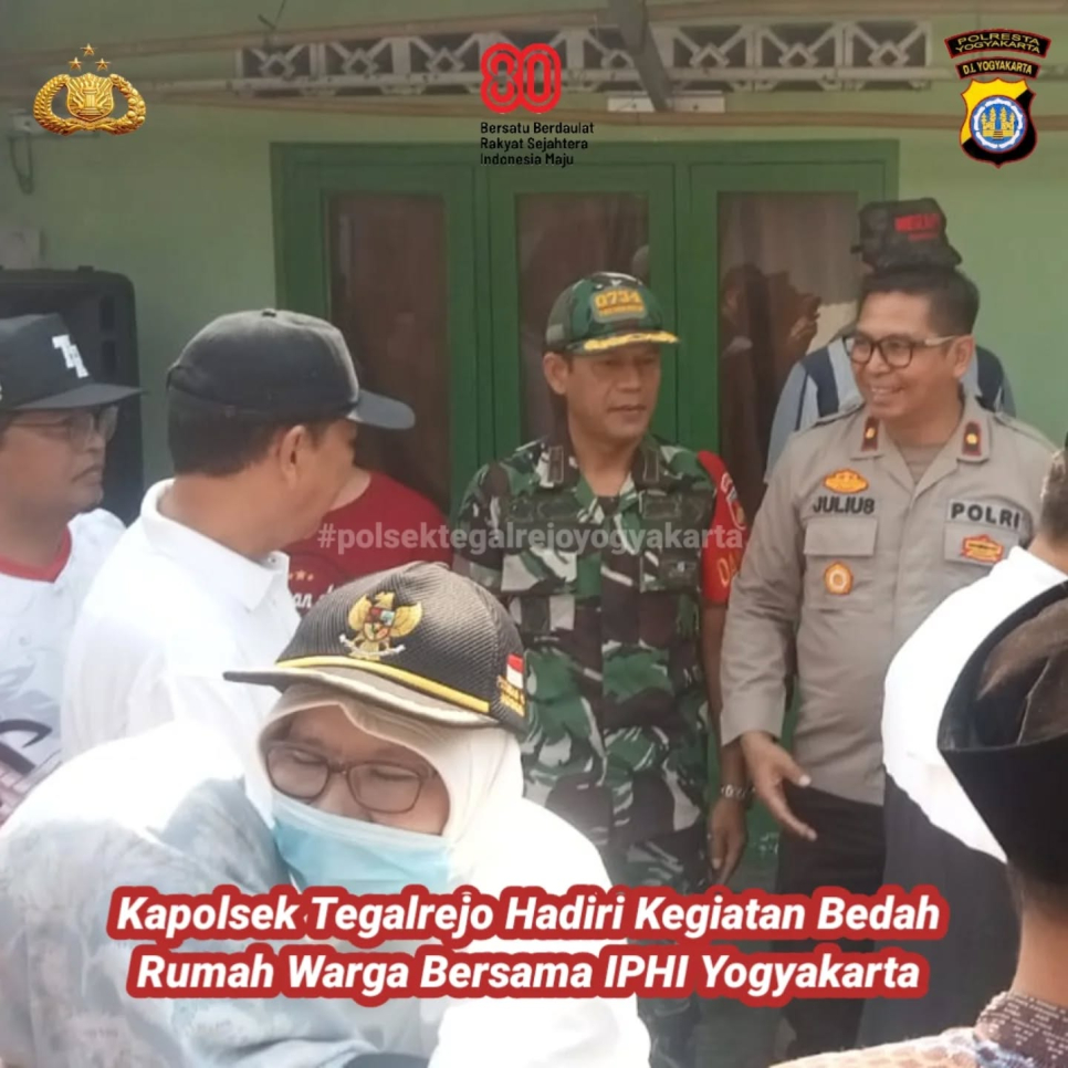Kapolsek Tegalrejo, Kompol Julius Meta Jiwa, S.H., didampingi Bhabinkamtibmas Kelurahan Tegalrejo, Aipda Indarno, S.H., menghadiri kegiatan bedah rumah milik Ibu Slamet Priyo Utomo, warga RT 14 RW 04 Kampung Tegalrejo. Kegiatan sosial ini diselenggarakan oleh Ikatan Persaudaraan Haji Indonesia (IPHI) Yogyakarta pada Minggu (19/10/2025) pagi.Acara tersebut turut dihadiri oleh Wali Kota Yogyakarta, Kepala OPD, Forkopimtren Tegalrejo, Lurah se-Kemantren Tegalrejo, serta tokoh masyarakat setempat.