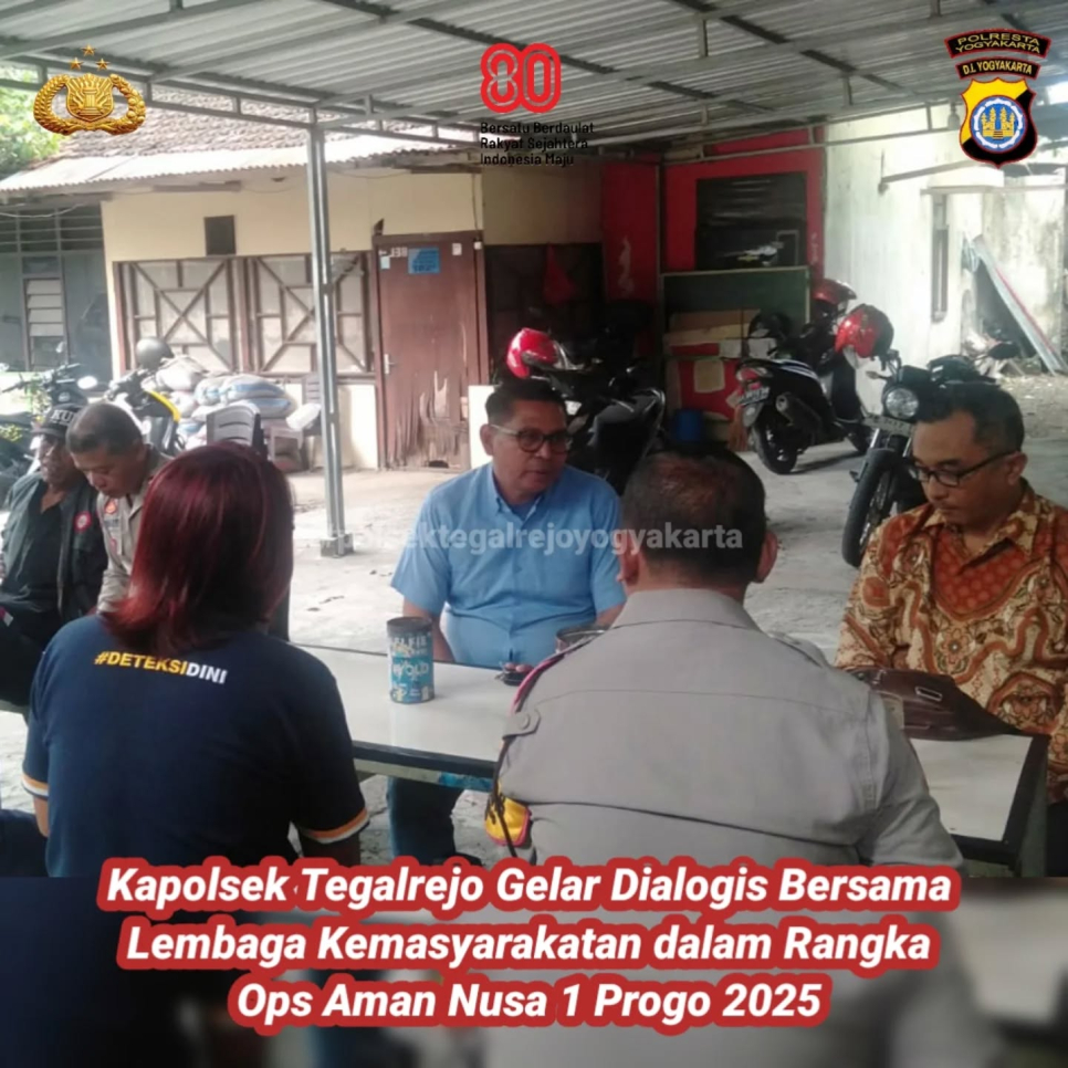 Dalam rangka Operasi Aman Nusa 1 Progo 2025, Kapolsek Tegalrejo Kompol Julius Meta Jiwa, S.H. bersama Bhabinkamtibmas Kelurahan Bener Aiptu Binarto serta Bhabinkamtibmas Kelurahan Karangwaru Bripka Sugeng Haryanto melaksanakan kegiatan dialogis dengan lembaga kemasyarakatan di wilayah Kemantren Tegalrejo. Kegiatan tersebut berlangsung pada Selasa sore (09/09/2025) di selatan Mako Polsek Tegalrejo, Jl. Magelang No. 184 Yogyakarta.Dialogis diikuti oleh perwakilan LPMK, KUB, FKDM, dan Jaga Warga dengan pembahasan seputar situasi kamtibmas serta langkah-langkah mendorong peran aktif masyarakat dalam menjaga keamanan lingkungan. Dalam kesempatan itu, peserta juga diimbau untuk tidak mudah terpengaruh berita bohong maupun ajakan provokatif yang dapat memecah belah persatuan dan mengarah pada tindakan anarkis.