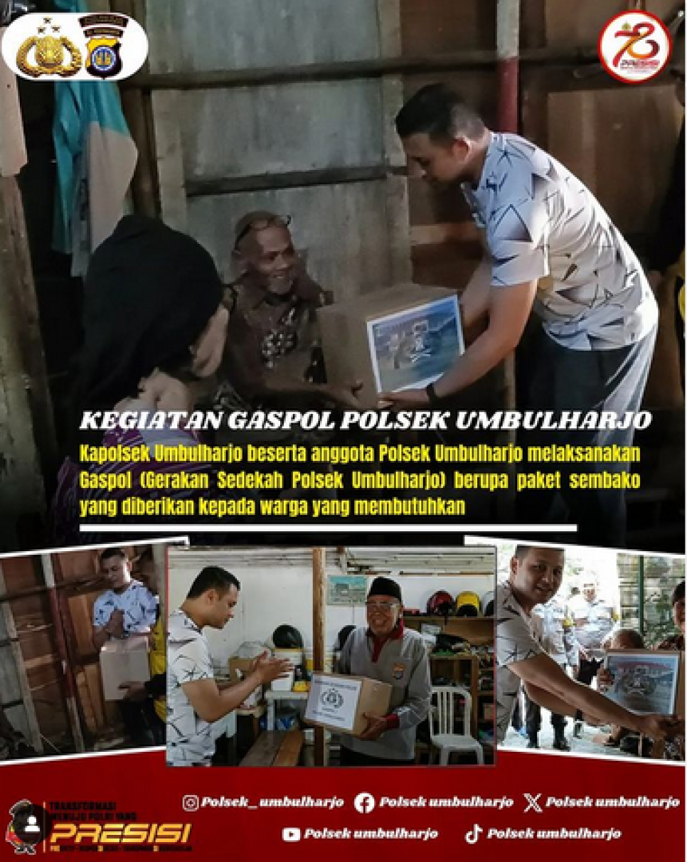 Dalam rangka meningkatkan kepedulian terhadap sesama, Polsek Umbulharjo kembali menggelar kegiatan GASPOL (Gerakan Sedekah Polsek Umbulharjo). Pada Jumat (26/07/2024), Kapolsek Umbulharjo, AKP Wahyu Agha Ari Septyan S, S.I.K., beserta jajarannya secara langsung menyerahkan paket sembako kepada warga yang membutuhkan di wilayah Umbulharjo.Kegiatan ini tidak hanya bertujuan untuk meringankan beban ekonomi masyarakat kurang mampu, tetapi juga sebagai bentuk nyata sinergitas antara Polri dan masyarakat. Dengan menjalin silaturahmi yang lebih erat, diharapkan dapat tercipta suasana yang aman dan kondusif. (Humas Polsek Umbulharjo)