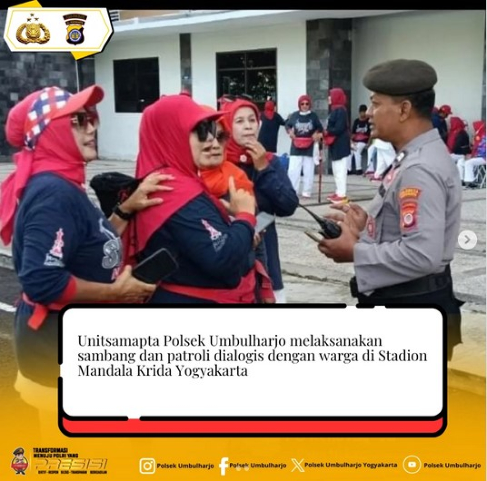 Panit Samapta Polsek Umbulharjo Aiptu Jarsito bersama anggotanya melaksanakan patroli dialogis di kawasan Stadion Mandala Krida, Yogyakarta, pada Sabtu pagi (1/11/2025). Dalam kegiatan tersebut, petugas menyapa warga yang sedang berolahraga pagi sekaligus menyampaikan pesan-pesan kamtibmas untuk menjaga keamanan dan ketertiban di lingkungan sekitar.Kepada masyarakat yang berolahraga, Aiptu Jarsito mengimbau agar selalu waspada terhadap potensi kejahatan seperti copet, jambret, atau pencurian kendaraan bermotor. Ia juga mengingatkan agar tidak meninggalkan barang berharga tanpa pengawasan, menjaga ketertiban selama berolahraga, tidak mengganggu pengguna lapangan lain, serta tetap menjaga kebersihan dengan membuang sampah pada tempatnya. Warga juga diminta memperhatikan kondisi sekitar, terutama jika membawa anak-anak, dan segera melapor kepada petugas keamanan apabila menemukan hal yang mencurigakan.