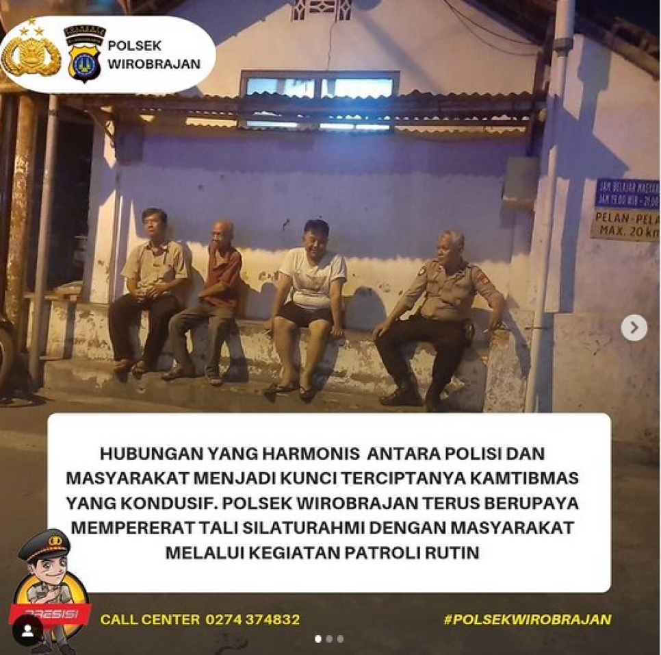 Kapolsek Wirobrajan, Kompol Ahmad Djaeni, S.H., M.H., mengatakan bahwa patroli dialogis ini merupakan salah satu upaya Polsek Wirobrajan untuk mempererat hubungan antara polisi dan masyarakat. "Dengan menjalin silaturahmi yang baik, diharapkan dapat tercipta sinergi yang kuat antara Polri dan masyarakat dalam menjaga Kamtibmas," ujar Kapolsek. (Humas Polsek Wirobrajan)