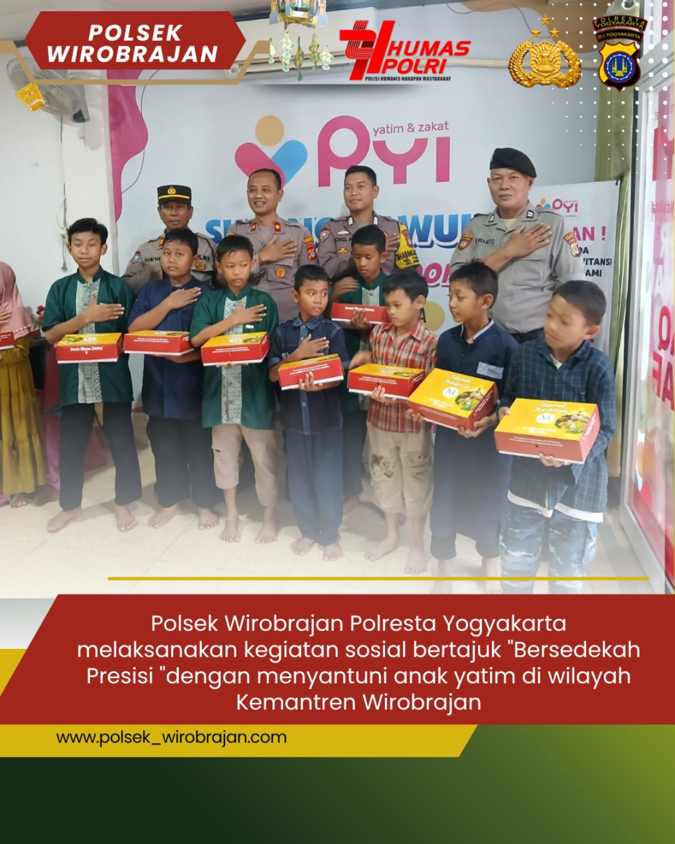 Polsek Wirobrajan Polresta Yogyakarta menunjukkan perhatian sosialnya melalui kegiatan "Bersedekah Presisi" dengan menyantuni anak-anak yatim di wilayah Kemantren Wirobrajan pada Kamis, 20 November 2025.Acara sosial ini dipimpin langsung oleh Kapolsek Wirobrajan, Kompol Arif Darmawan, S.H., M.A.P., didampingi jajaran personel Polsek. Dalam kegiatan tersebut, Kapolsek dan anggota menyalurkan paket sedekah berupa nasi kotak.