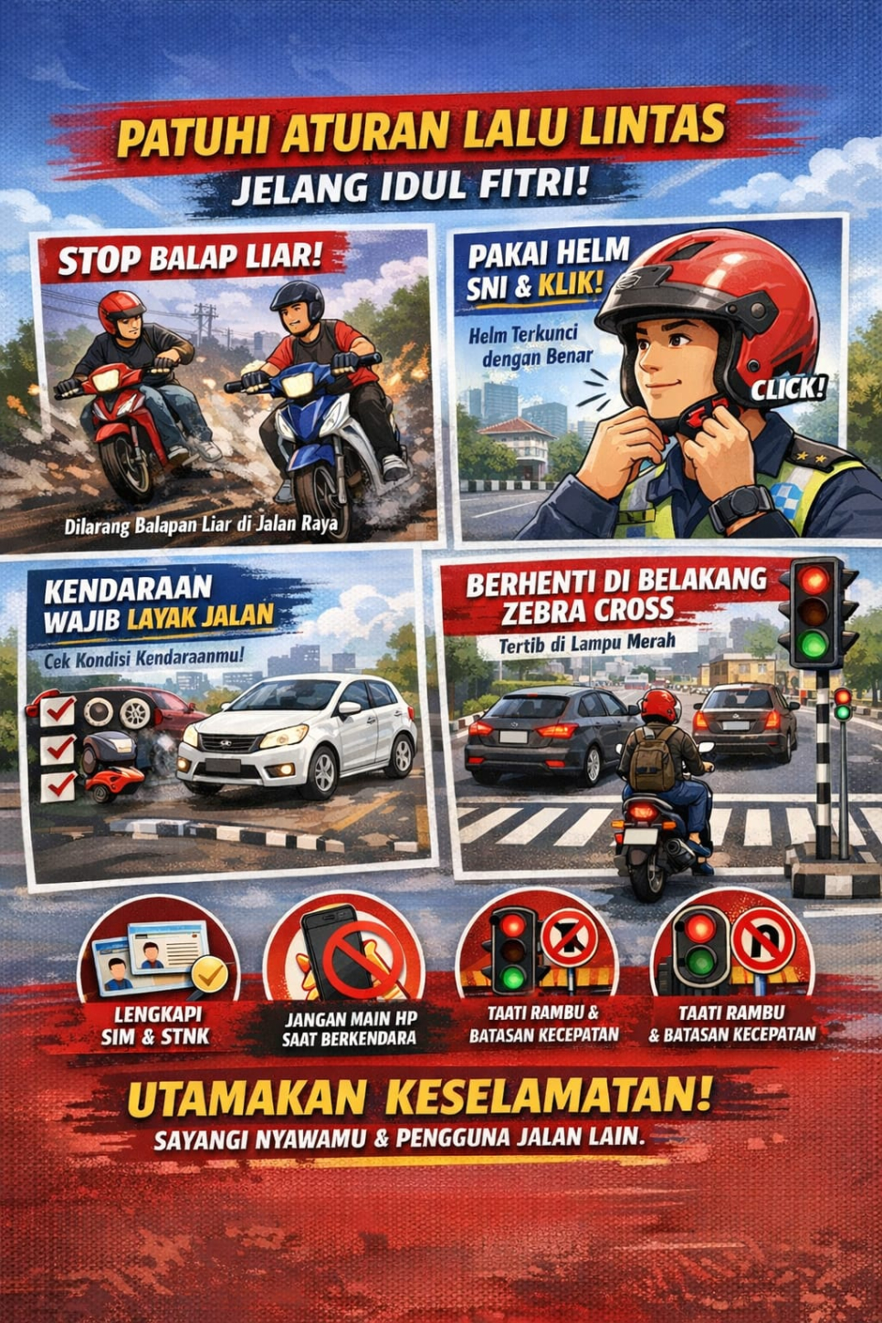 Pengendara diingatkan untuk selalu membawa SIM dan STNK yang sah. Selain itu, hindari penggunaan telepon seluler saat berkendara karena konsentrasi penuh merupakan faktor utama dalam mencegah terjadinya kecelakaan lalu lintas.