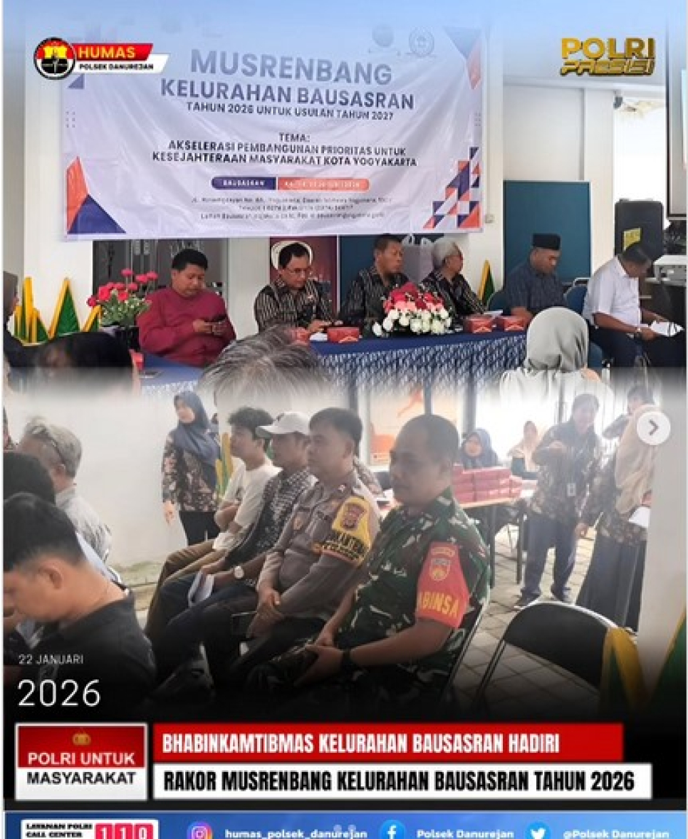 Bertempat di Pendopo Kantor Kelurahan Bausasran, Bhabinkamtibmas Kelurahan Bausasran Aiptu Agus Hartanto menghadiri undangan Rapat Koordinasi (Rakor) Musyawarah Perencanaan Pembangunan (Musrenbang) Kelurahan Bausasran Tahun 2026 untuk usulan program tahun 2027, pada Kamis (15/1/2026) pukul 13.00 WIB.Kegiatan Musrenbang tersebut diselenggarakan oleh Pemerintah Kelurahan Bausasran dengan mengusung tema "Akselerasi Pembangunan Prioritas untuk Kesejahteraan Masyarakat Kota Yogyakarta". Melalui forum ini, diharapkan aspirasi masyarakat dapat terakomodasi sesuai kebutuhan dan skala prioritas, dengan tetap menyesuaikan pada ketersediaan anggaran.