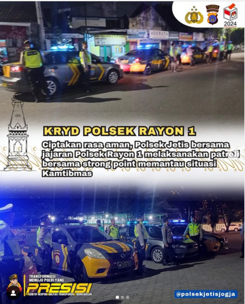 Polsek Jetis bersama jajaran Polsek Rayon 1 Polresta Yogyakarta menunjukkan sinergi yang baik dalam menjaga keamanan dan ketertiban masyarakat. Salah satu bentuk sinergi tersebut adalah dengan menggelar patroli bersama secara rutin (KRYD).Pada Jumat (26/7/24) tengah malam, patroli bersama dilaksanakan dengan menyisir kawasan penggal jalan di wilayah hukum Polsek Rayon 1 (Polsek Tegalrejo, Polsek Jetis, Polsek Gedongtengen, dan Polsek Ngampilan). Kegiatan ini bertujuan untuk menciptakan situasi yang kondusif dan memberikan rasa aman kepada masyarakat. (Humas polsek Jetis)