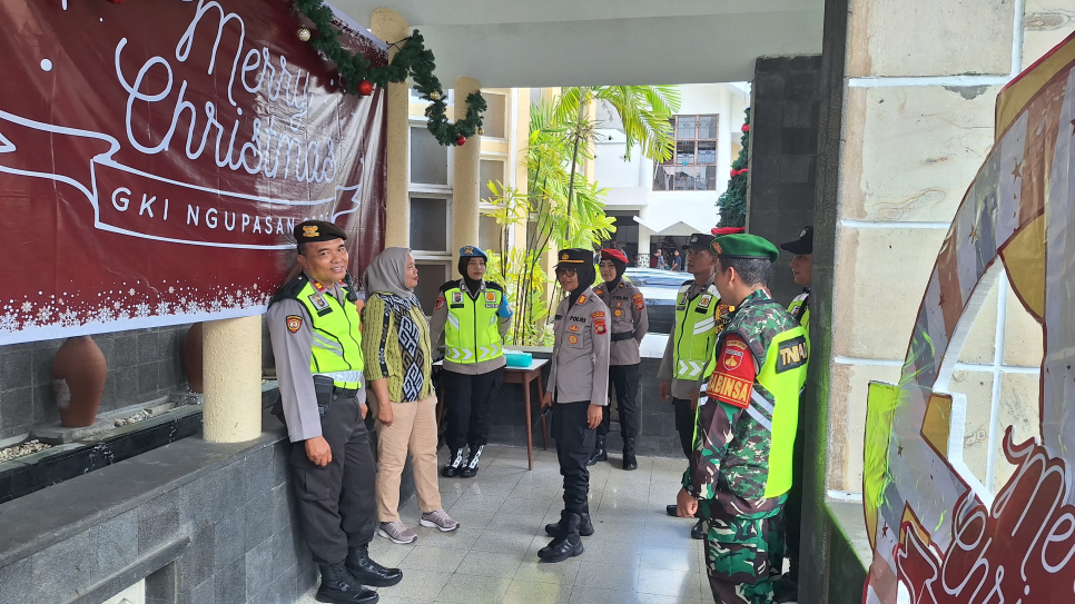Aparat gabungan lintas instansi melakukan pengamanan pada ibadah kebaktian Perayaan Natal 2025 di Gereja Kristen Indonesia (GKI) Ngupasan, Yogyakarta, Kamis (25/12/2025) malam ini. Pengamanan ini dipimpin langsung oleh Kapolsek Ngampilan, AKP Sriyati, S.Sos., M.Si.Personel yang dikerahkan merupakan gabungan dari unsur TNI-Polri, Bhabinkamtibmas, Linmas, BKO Satpol PP Kemantren Ngampilan, serta kelompok Jaga Warga. Kolaborasi ini bertujuan untuk memastikan seluruh rangkaian prosesi ibadah berjalan tanpa hambatan keamanan.
