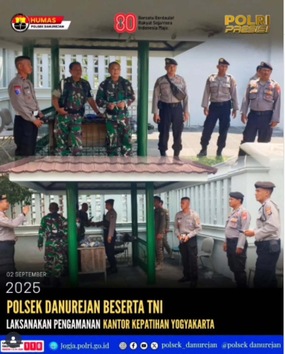 Kapolsek Danurejan AKP Annas Ma'aruf Zamroni, S.H., M.A.P., bersama personelnya, melaksanakan pengamanan dan antisipasi aksi unjuk rasa di Kantor Kepatihan Yogyakarta pada Selasa, 2 September 2025.Pengamanan ini merupakan wujud sinergi antara TNI dan Polri untuk menjaga keamanan dan ketertiban, khususnya di sekitar objek vital pemerintahan. Kehadiran aparat di lapangan bertujuan memastikan kegiatan masyarakat berlangsung tertib, aman, dan kondusif, serta mencegah potensi gangguan Kamtibmas.