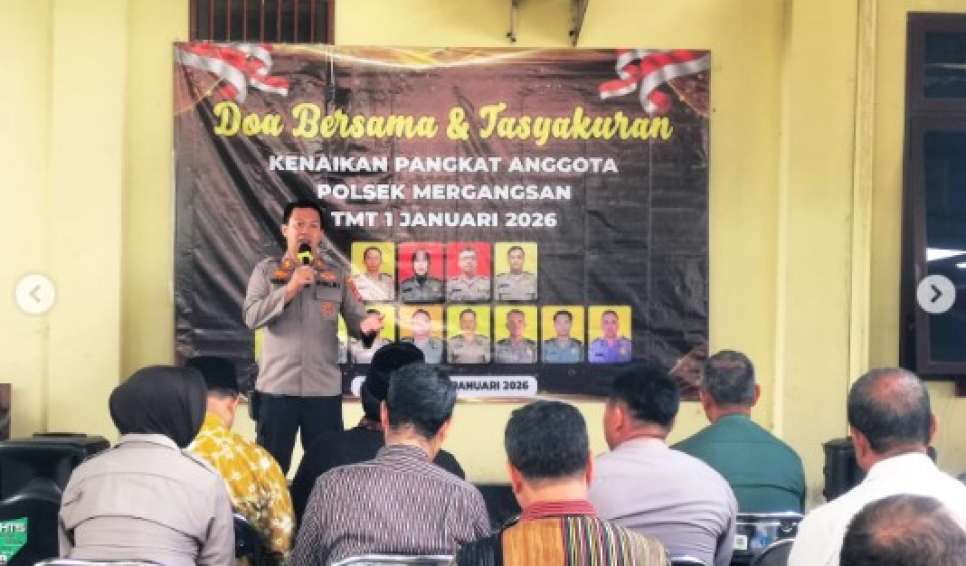 Mengawali kalender tugas tahun 2026 dengan semangat baru, Polsek Mergangsan menggelar acara doa bersama yang dirangkaikan dengan syukuran kenaikan pangkat personel di halaman Mapolsek Mergangsan, Kamis (8/1/2026). Kegiatan yang berlangsung khidmat ini dihadiri oleh jajaran Forkopimtren Mergangsan serta seluruh anggota kepolisian setempat.Sebanyak dua belas personel Polsek Mergangsan resmi menyandang pangkat satu tingkat lebih tinggi per Januari 2026. Kenaikan pangkat ini diberikan sebagai bentuk apresiasi atas prestasi, dedikasi, serta disiplin tinggi yang ditunjukkan anggota dalam menjalankan tugas tanpa catatan pelanggaran.