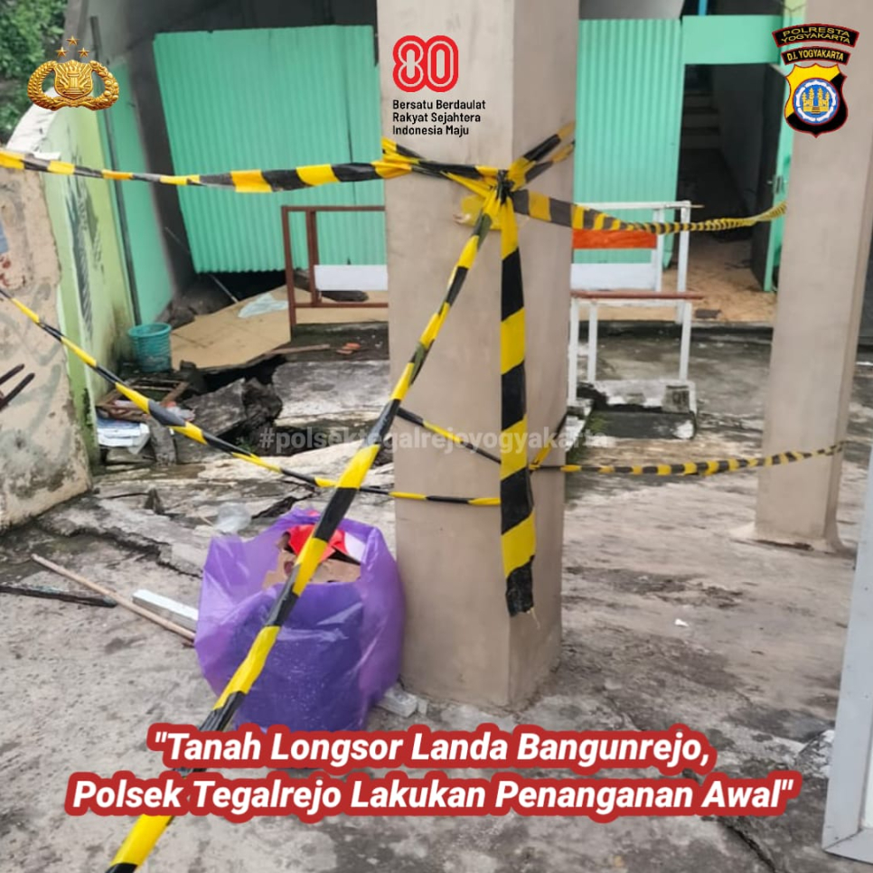 Peristiwa tanah longsor terjadi di Kampung Bangunrejo RT 57 RW 13, Kelurahan Kricak, Kemantren Tegalrejo, pada Minggu (23/11/2025) sekitar pukul 14.00 WIB. Longsor tersebut menimpa area Balai RT 57, menyebabkan pondasi bangunan amblas dan menimbulkan retakan parah pada dinding sisi selatan yang berdekatan langsung dengan aliran Sungai Buntung. Kerugian materi akibat kejadian ini ditaksir mencapai sekitar Rp100.000.000,-, namun beruntung tidak ada korban jiwa dalam musibah tersebut.Menyikapi kejadian ini, personel Polsek Tegalrejo di bawah pimpinan Pawas Kanit Lantas AKP Agustinus Supriyadi segera mendatangi lokasi kejadian. Petugas langsung mengambil tindakan pencegahan dengan memasang garis polisi (police line) pada area yang dianggap rawan. Warga setempat diimbau keras agar tidak mendekat dan tidak melakukan aktivitas di sekitar titik longsor, mengingat kondisi tanah masih sangat labil dan berpotensi memicu longsor susulan.