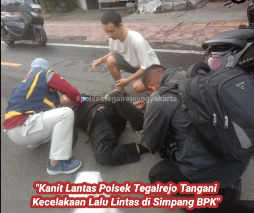 Kanit Lantas Polsek Tegalrejo AKP Agustinus Supriyadi bersama anggota menangani kejadian kecelakaan lalu lintas di Simpang BPK, Jalan Pembela Tanah Air, Kelurahan Tegalrejo, Kota Yogyakarta, Kamis pagi (1/1/2026).Dalam penanganan tersebut, petugas segera melakukan pengamanan tempat kejadian perkara (TKP), pengaturan arus lalu lintas guna mencegah kemacetan, serta mengevakuasi korban ke Rumah Sakit Panti Rapih Yogyakarta dengan menggunakan ambulans PRC Kota Yogyakarta.