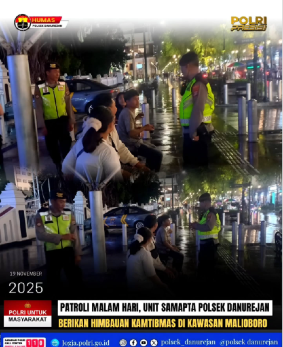 Unit Samapta Polsek Danurejan Polresta Yogyakarta yang dipimpin Panit Samapta Aiptu Agung Riyadi melaksanakan patroli malam di kawasan Malioboro, Yogyakarta, pada Rabu (19/11/2025). Patroli dilakukan untuk memastikan situasi kamtibmas tetap aman serta memberikan rasa nyaman bagi wisatawan dan masyarakat yang beraktivitas di area tersebut.Dalam kegiatan ini, petugas menyambangi beberapa titik rawan dan berdialog dengan para pengunjung. Petugas mengimbau wisatawan agar menyimpan dompet, telepon genggam, serta barang berharga di tempat aman, seperti saku depan atau tas yang tertutup rapat. Wisatawan juga disarankan untuk tidak memakai perhiasan mencolok yang dapat menarik perhatian pelaku kejahatan, serta tidak meninggalkan barang bawaan tanpa pengawasan.