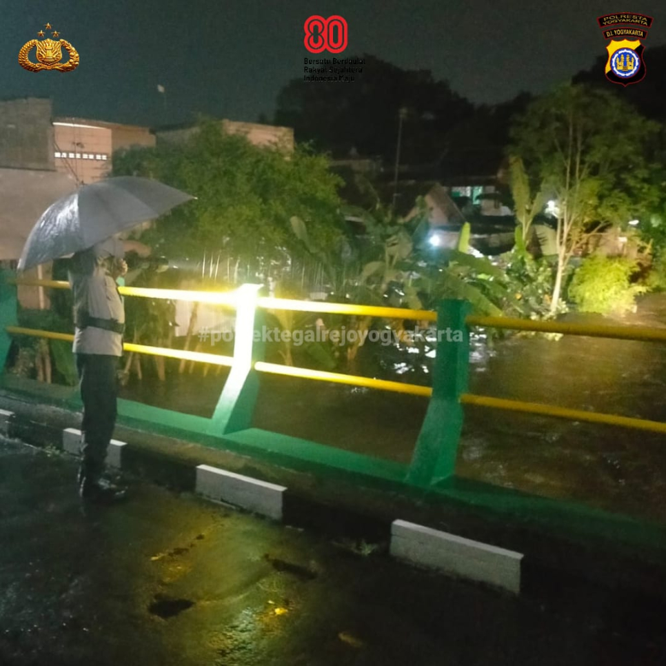 Personel Unit Samapta Polsek Tegalrejo yang dipimpin Panit 1 Samapta, Aiptu Sumarmo, melaksanakan pemantauan debit air Sungai Winongo pada Selasa (2/12/2025) malam. Pemantauan dilakukan di sepanjang aliran sungai yang berada di perbatasan Kelurahan Kricak dan Kelurahan Bener, menyusul intensitas hujan yang cukup tinggi.Hasil pengecekan menunjukkan bahwa debit air sempat mengalami kenaikan saat hujan deras. Namun setelah hujan reda, kondisi berangsur menurun dan kembali mendekati batas normal.
