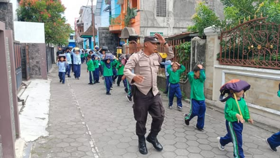 Suara sirene meraung memecah ketenangan di SD Negeri Gedongkuning, Jumat pagi (09/01/2026). Ratusan murid terlihat sigap bersembunyi di bawah meja sebelum akhirnya dievakuasi menuju titik kumpul dengan pengawasan guru dan petugas. Suasana ini merupakan bagian dari simulasi gempa bumi dalam program Satuan Pendidikan Aman Bencana (SPAB).Bhabinkamtibmas Kelurahan Rejowinangun, Aiptu Bandang Setiawan, hadir langsung memantau jalannya pelatihan yang diselenggarakan oleh BPBD Kota Yogyakarta bekerja sama dengan Dinas Pendidikan Kota Yogyakarta. Kegiatan ini melibatkan seluruh peserta didik, tenaga pendidik, serta perwakilan warga di sekitar lingkungan sekolah.